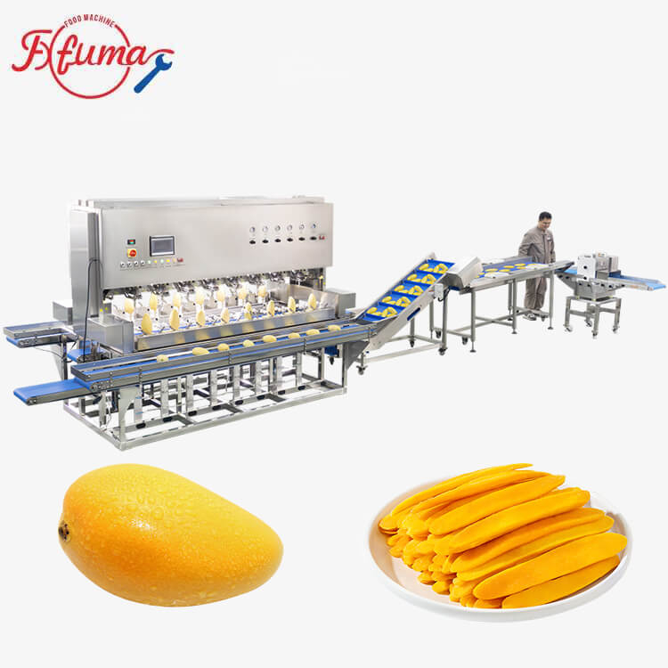 Processing lines producing mango strips, cubes, or half-processed fruit for further packaging.
